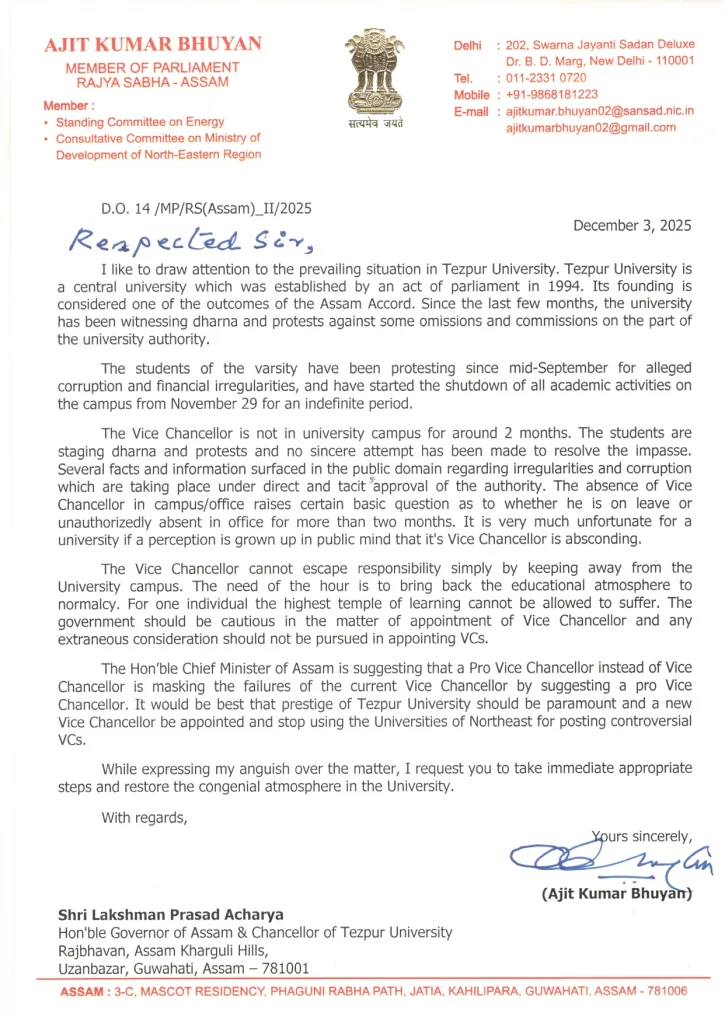 তেজপুৰ বিশ্ববিদ্যালয়ৰ অচলাৱস্থাক লৈ ৰাজ্যপাললৈ পত্ৰ সাংসদ অজিত কুমাৰ ভূঞাৰ