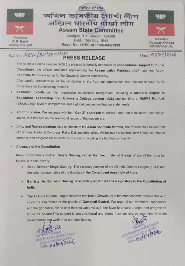 আগন্তুক নিৰ্বাচনৰ প্ৰাকক্ষণত মধ্য গুৱাহাটী সমষ্টিত ৰাজনৈতিক তৎপৰতা বৃদ্ধি পাইছে। ইয়াৰ মাজতে, সমষ্টিটোৰ অসম জাতীয় পৰিষদ (AJP) আৰু বিৰোধীৰ ‘অসম সন্মিলিত মৰ্চা’ৰ উমৈহতীয়া প্ৰাৰ্থী কুংকি চৌধুৰীলৈ বিনাচৰ্তে সমৰ্থন আগবঢ়াইছে অখিল ভাৰতীয় গোৰ্খা লীগে (AIGL)। শুকুৰবাৰে এক আনুষ্ঠানিক প্ৰেছ বিজ্ঞপ্তিৰ জৰিয়তে গোৰ্খা লীগৰ অসম ৰাজ্যিক সমিতিয়ে এই কথা ঘোষণা কৰে। অখিল ভাৰতীয় গোৰ্খা লীগৰ অসম ৰাজ্যিক […] The post অসম সন্মিলিত মৰ্চাৰ মধ্য গুৱাহাটী সমষ্টিৰ প্ৰাৰ্থী কুংকি চৌধুৰীলৈ অখিল ভাৰতীয় গোৰ্খা লীগৰ বিনাচৰ্ত সমৰ্থন appeared first on NORTHEAST NOW (Assamese) .