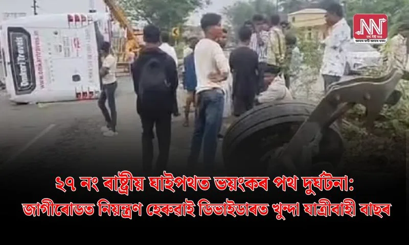 আজি পুৱাৰ ভাগত জাগীৰোডৰ সমীপৰ ২৭ নং ৰাষ্ট্ৰীয় ঘাইপথত এক ভয়ংকৰ পথ দুৰ্ঘটনা সংঘটিত হয়। উজনি অসমৰ পৰা গুৱাহাটী অভিমুখে গৈ থকা এখন দ্ৰুতবেগী যাত্ৰীবাহী বাছে নিয়ন্ত্ৰণ হেৰুৱাই পথৰ ডিভাইডাৰত খুন্দা মৰাৰ ফলত এই শোকাৱহ ঘটনাটো সংঘটিত হয়। প্ৰাথমিক খবৰ অনুসৰি, এই দুৰ্ঘটনাত বাছখনত থকা কেইবাজনো যাত্ৰী গুৰুতৰভাৱে আহত হৈছে। তীব্ৰবেগী বাছখনে ডিভাইডাৰত খুন্দা মৰাৰ […] The post ২৭ নং ৰাষ্ট্ৰীয় ঘাইপথত ভয়ংকৰ পথ দুৰ্ঘটনা: জাগীৰোডত নিয়ন্ত্ৰণ হেৰুৱাই ডিভাইডাৰত খুন্দা যাত্ৰীবাহী বাছৰ appeared first on NORTHEAST NOW (Assamese) .