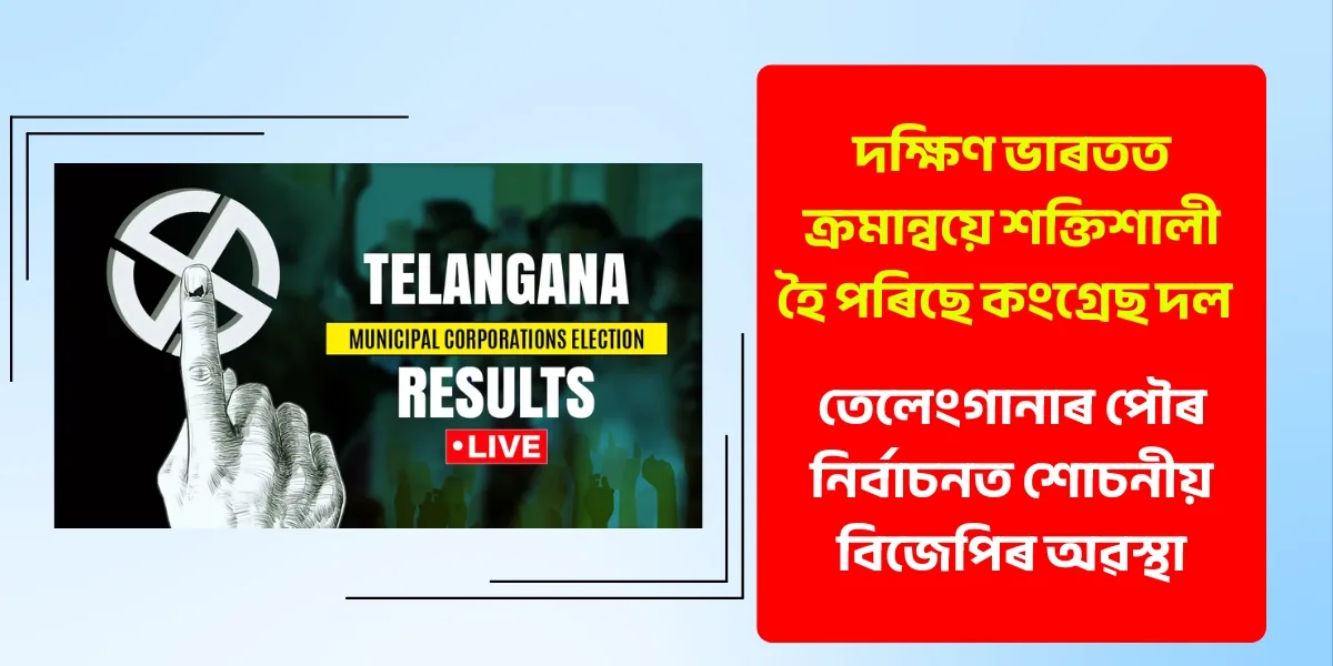 দক্ষিণ ভাৰতত ক্ৰমান্বয়ে শক্তিশালী হৈ পৰিছে কংগ্ৰেছ দল। কেৰালাৰ পাছত এইবাৰ তেলেংগানাৰ পৌৰ নিৰ্বাচনত হাত শিবিৰৰ একচেটিয়া আধিপত্য দেখিবলৈ পোৱা গৈছে। শুকুৰবাৰে দুপৰীয়ালৈকে অহা প্ৰাৰম্ভিক ফলাফল অনুসৰি তেলেংগানাত কংগ্ৰেছৰ জোৱাৰত বিজেপিৰ প্ৰায় উটি যোৱাৰ দৰে অৱস্থা হৈছে। আনহাতে যোৱা লোকসভা নিৰ্বাচনত শোচনীয় পৰাজয় বৰণ কৰা ভাৰত ৰাষ্ট্ৰ সমিতি চমুকৈ বিআৰএছে এইবাৰ স্থানীয় নিৰ্বাচনত কিছু পৰিমাণে […] The post দক্ষিণ ভাৰতত ক্ৰমান্বয়ে শক্তিশালী হৈ পৰিছে কংগ্ৰেছ দল : তেলেংগানাৰ পৌৰ নিৰ্বাচনত শোচনীয় বিজেপিৰ অৱস্থা appeared first on NORTHEAST NOW (Assamese) .