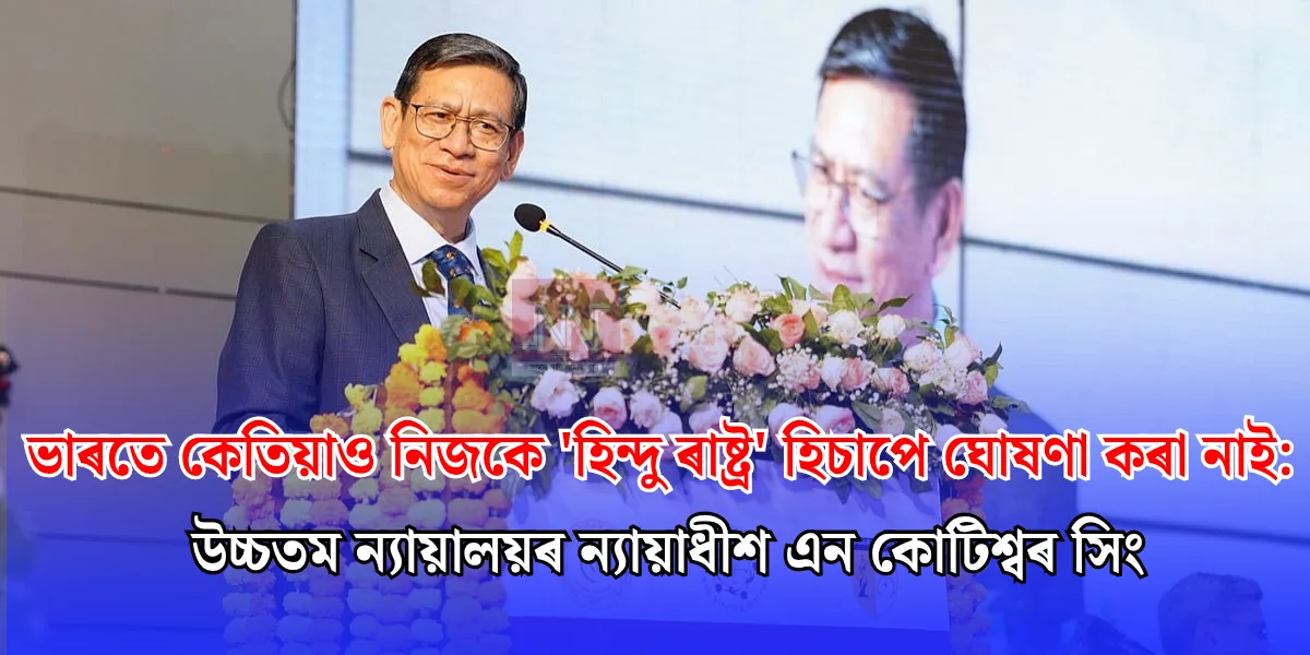 উচ্চতম ন্যায়ালয়ৰ ন্যায়াধীশ এন কোটিশ্বৰ সিঙে স্পষ্ট কৰি দিছে যে ভাৰতৰ সাংবিধানিক পৰিচয়ে বহুত্ববাদক প্ৰতিফলিত কৰে আৰু দেশখনে কেতিয়াও নিজকে এখন ‘হিন্দু ৰাষ্ট্ৰ’ হিচাপে ঘোষণা কৰা নাই। শেহতীয়াকৈ নেচনেল ল’ ইনষ্টিটিউট ইউনিভাৰ্চিটিৰ (NLIU) এছ বি এ (SBA) সন্মিলনত অংশগ্ৰহণ কৰি ন্যায়াধীশগৰাকীয়ে ভাৰতীয় সংবিধানৰ গুৰুত্ব আৰু ইয়াৰ ধৰ্মনিৰপেক্ষ চৰিত্ৰৰ ওপৰত বিশেষ আলোকপাত কৰে। তেওঁ কয় যে […] The post ভাৰতে কেতিয়াও নিজকে ‘হিন্দু ৰাষ্ট্ৰ’ হিচাপে ঘোষণা কৰা নাই: উচ্চতম ন্যায়ালয়ৰ ন্যায়াধীশ এন কোটিশ্বৰ সিং appeared first on NORTHEAST NOW (Assamese) .