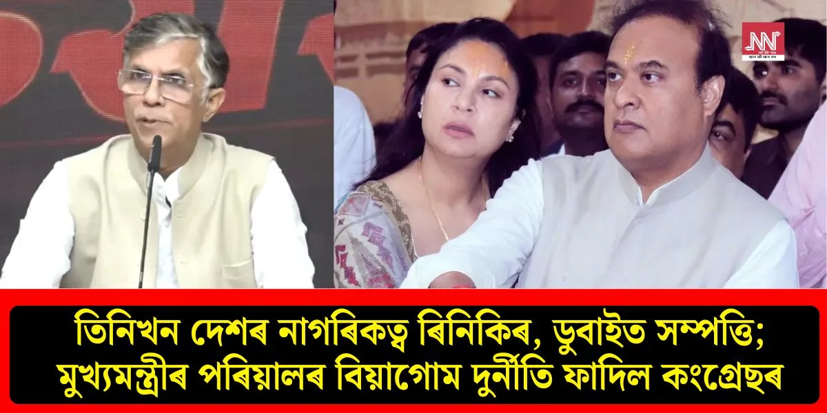 কংগ্ৰেছৰ জ্যেষ্ঠ নেতা পৱন খেৰাই আজি নতুন দিল্লীস্থিত এআইচিচিৰ মুখ্য কাৰ্যালয়ত এখন সংবাদমেল সম্বোধন কৰি অসমৰ মুখ্যমন্ত্ৰী হিমন্ত বিশ্ব শৰ্মা আৰু তেওঁৰ পত্নী ৰিনিকী ভূঞা শৰ্মাৰ বিৰুদ্ধে কেতবোৰ গুৰুতৰ অভিযোগ উত্থাপন কৰে। খেৰাই দাবী কৰে যে ৰিনিকি ভূঞা শৰ্মাৰ হাতত ইজিপ্ত, ইউ এ ই, আৰু এন্টিগুয়া এণ্ড বাৰ্বুডা- তিনিখন দেশৰ সক্ৰিয় পাছপ’ৰ্ট আছে। ইয়াৰ ফলত […] The post তিনিখন দেশৰ নাগৰিকত্ব ৰিনিকিৰ, ডুবাইত সম্পত্তি; মুখ্যমন্ত্ৰীৰ পৰিয়ালৰ বিয়াগোম দুৰ্নীতি ফাদিল কংগ্ৰেছৰ appeared first on NORTHEAST NOW (Assamese) .