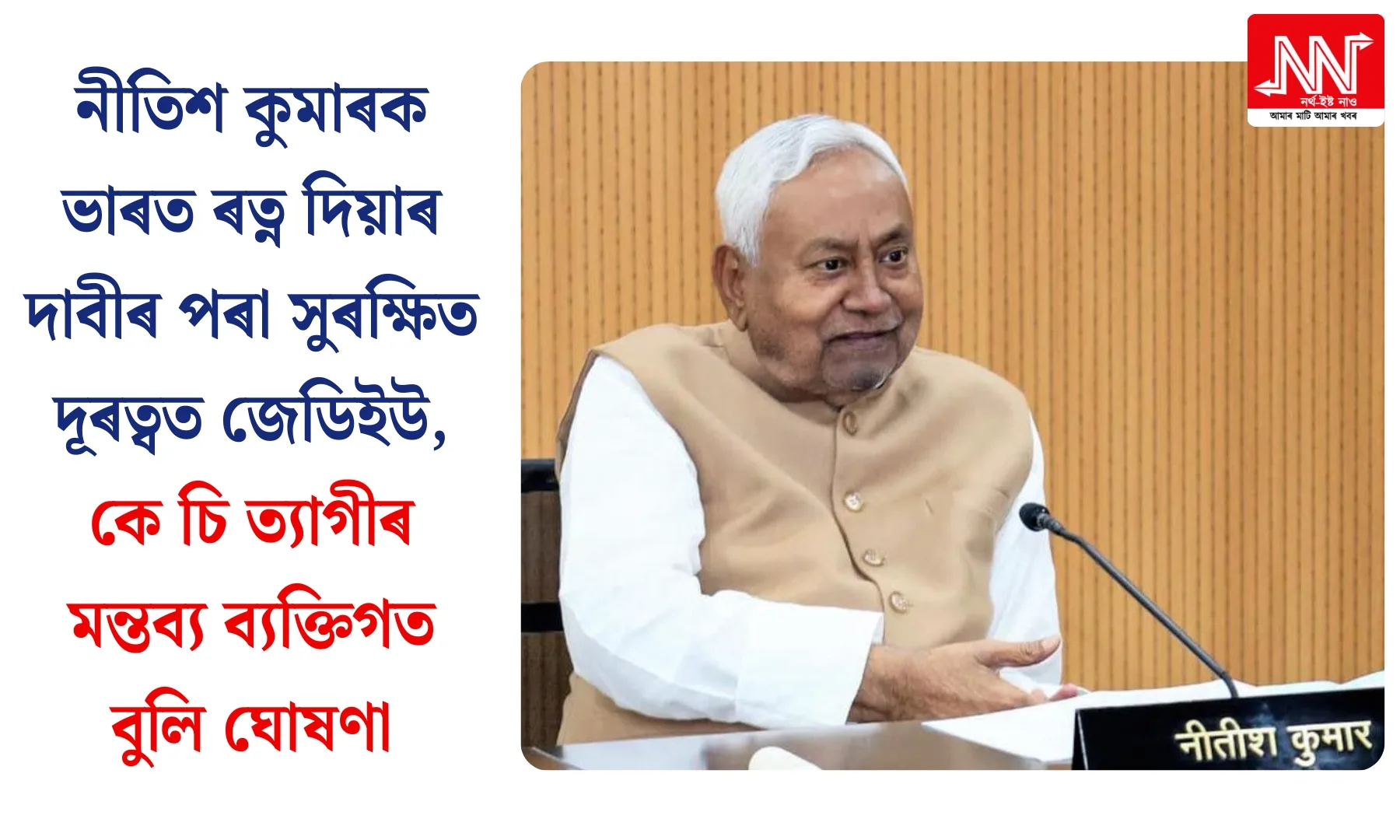 বিহাৰৰ মুখ্যমন্ত্ৰী নীতিশ কুমাৰক দেশৰ সৰ্বোচ্চ অসামৰিক সন্মান ভাৰত ৰত্ন প্ৰদানৰ বাবে জ্যেষ্ঠ নেতা তথা প্ৰাক্তন সাংসদ কে চি ত্যাগীয়ে কৰা আহ্বানৰ পৰা শনিবাৰে জনতা দল ইউনাইটেডে নিজকে স্পষ্টভাৱে আঁতৰাই ৰাখিছে। দলটোৱে এক চৰকাৰী বিবৃতিত উল্লেখ কৰিছে যে ত্যাগীৰ এনে মন্তব্য দলটোৰ মূল মতাদৰ্শ বা চৰকাৰী স্থিতিৰ সৈতে কোনো ধৰণে মিল নাই। যোৱা বৃহস্পতিবাৰে প্ৰধানমন্ত্ৰী […] The post নীতিশ কুমাৰক ভাৰত ৰত্ন দিয়াৰ দাবীৰ পৰা সুৰক্ষিত দূৰত্বত জেডিইউ, কে চি ত্যাগীৰ মন্তব্য ব্যক্তিগত বুলি ঘোষণা appeared first on NORTHEAST NOW (Assamese) .