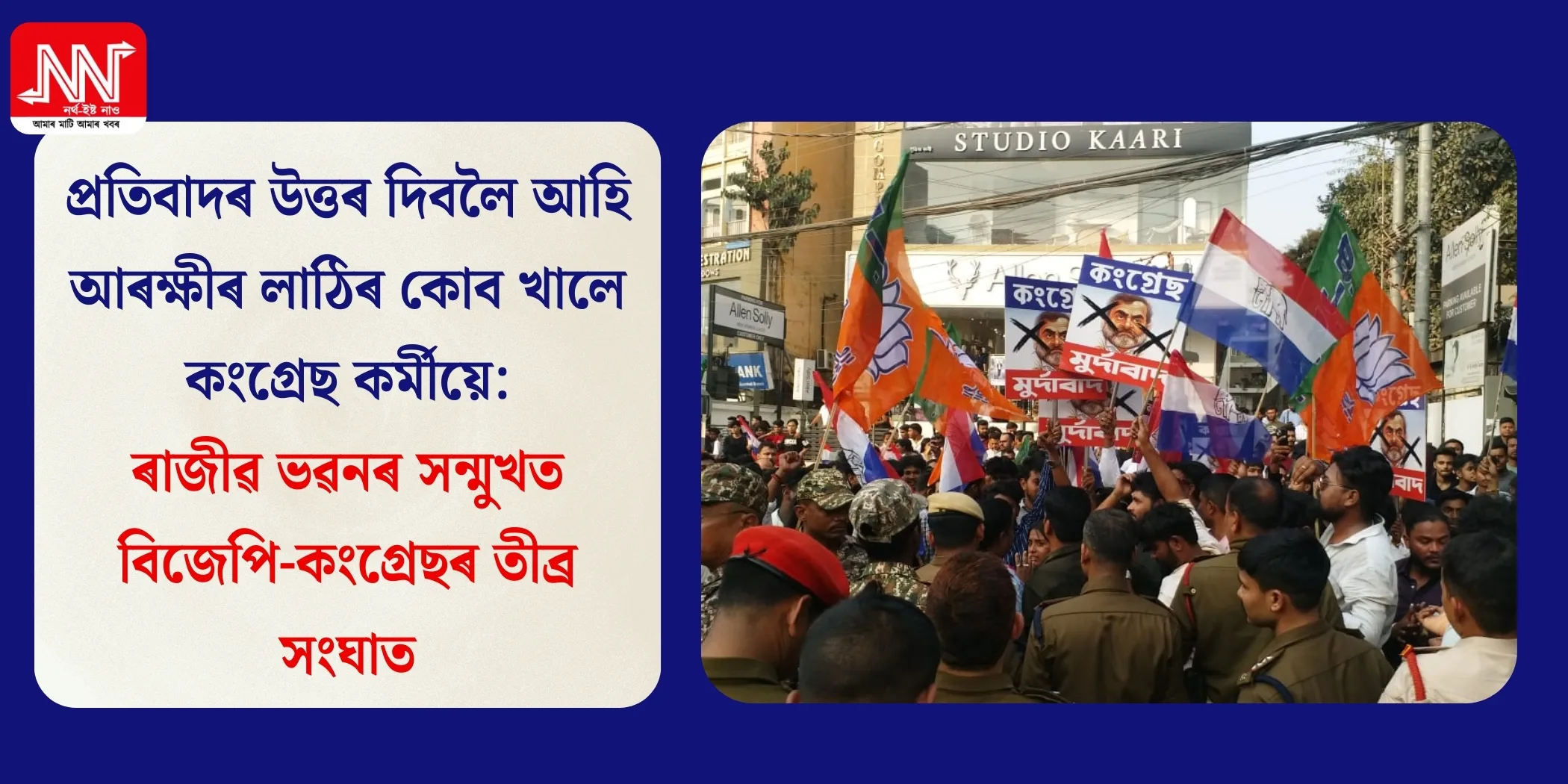গুৱাহাটীৰ ৰাজীৱ ভৱনৰ সন্মুখত শনিবাৰে বিজেপি আৰু কংগ্ৰেছ কৰ্মীৰ মাজত এক উত্তপ্ত পৰিস্থিতিৰ সৃষ্টি হয়। দিল্লীত অনুষ্ঠিত এ আই সন্মিলনত যুৱ কংগ্ৰেছে কৰা প্ৰতিবাদৰ বিৰোধিতা কৰি প্ৰায় দুই শতাধিক বিজেপি আৰু অসম গণ পৰিষদৰ সমৰ্থকে হাতে হাতে দলীয় পতাকা আৰু ৰাহুল গান্ধীৰ বেনাৰ লৈ ৰাজীৱ ভৱনৰ সন্মুখত প্ৰতিবাদ সাব্যস্ত কৰে। প্ৰতিবাদকাৰীসকলে কংগ্ৰেছ মুৰ্দাবাদ শ্ল’গান দিয়াৰ […] The post প্ৰতিবাদৰ উত্তৰ দিবলৈ আহি আৰক্ষীৰ লাঠিৰ কোব খালে কংগ্ৰেছ কৰ্মীয়ে: ৰাজীৱ ভৱনৰ সন্মুখত বিজেপি-কংগ্ৰেছৰ তীব্ৰ সংঘাত appeared first on NORTHEAST NOW (Assamese) .
