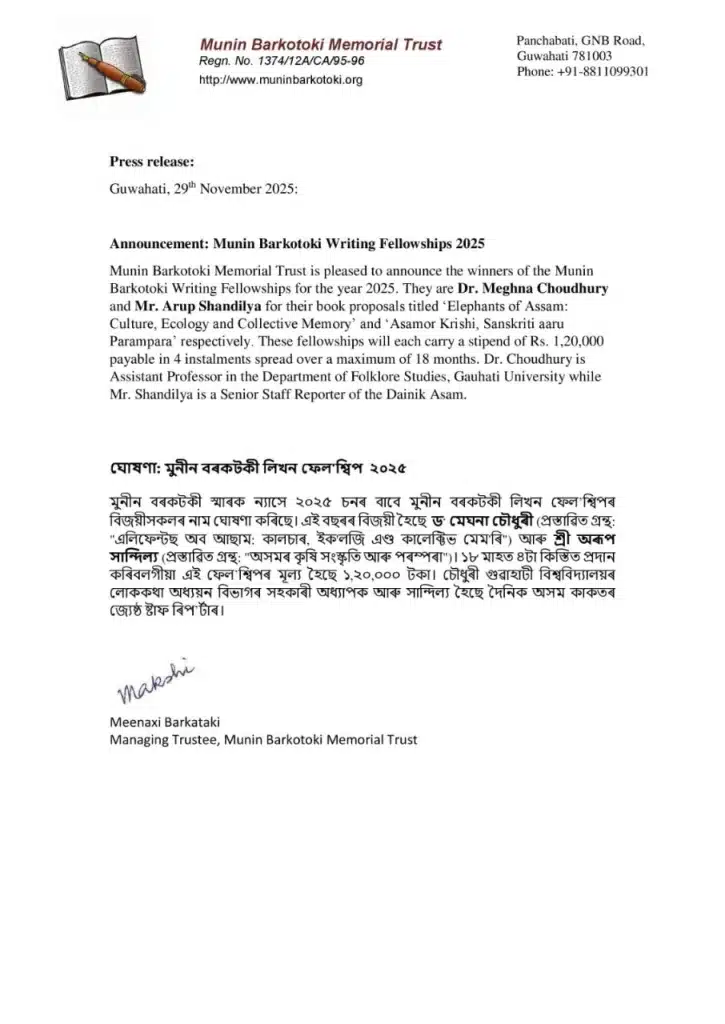 মুনীন বৰকটকী লিখন ফেল’শ্বিপ ২০২৫: ড০ মেঘনা চৌধুৰী আৰু অৰূপ শাণ্ডিল্যলৈ এই সন্মান