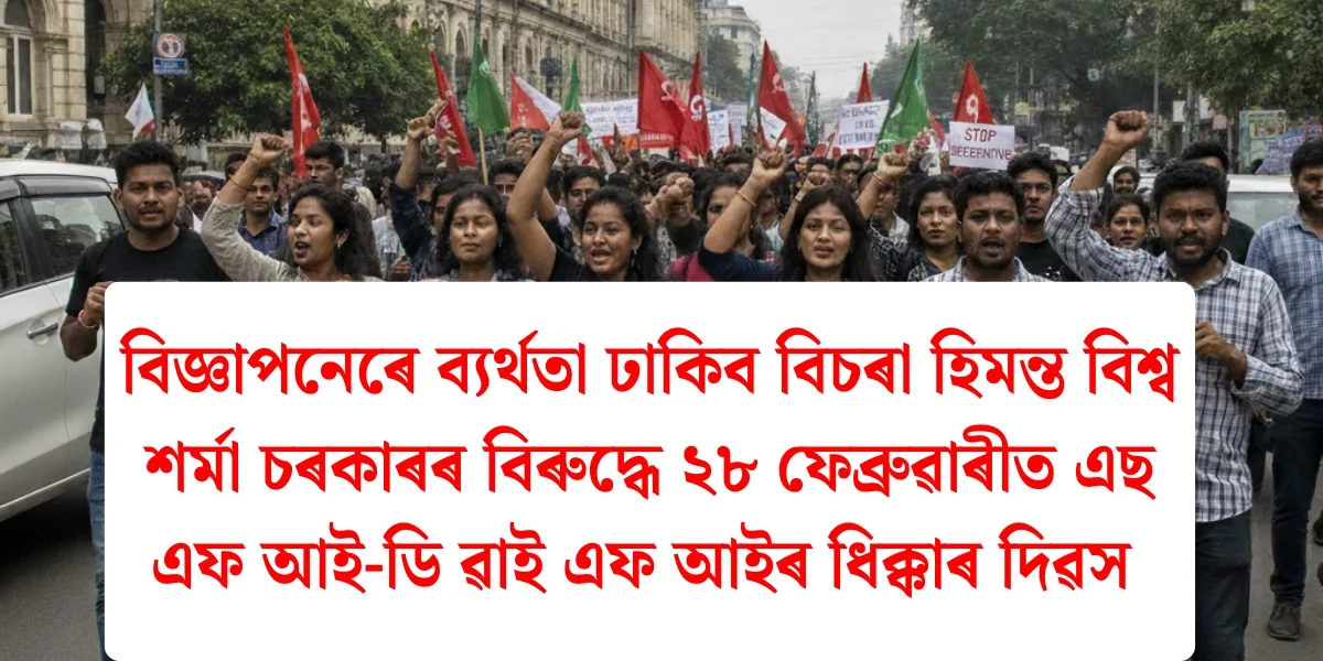 প্ৰতিশ্ৰুতিৰ বিপৰীতে গৈ লাখ লাখ যুৱ-ছাত্ৰৰ লগতে ৰাজ্যবাসীক চৰম প্ৰতাৰণা কৰা হিমন্ত বিশ্ব শৰ্মা নেতৃত্বাধীন বিজেপি চৰকাৰৰ বিৰুদ্ধে অহা ২৮ ফেব্ৰুৱাৰীত ধিক্কাৰ দিৱসৰ আয়োজন কৰিছে এছ এফ আই আৰু ডি ৱাই এফ আইয়ে। হিমন্ত বিশ্ব শৰ্মা চৰকাৰে পাছ বছৰ আৰু বিজেপি চৰকাৰে দহ বছৰ পূৰ্ণ কৰাৰ প্ৰাকক্ষণত নতুন পদ সৃষ্টিৰ পৰিৱৰ্তে লাখ লাখ পদ বিলুপ্তিৰ […] The post বিজ্ঞাপনেৰে ব্যৰ্থতা ঢাকিব বিচৰা হিমন্ত বিশ্ব শৰ্মা চৰকাৰৰ বিৰুদ্ধে ২৮ ফেব্ৰুৱাৰীত এছ এফ আই-ডি ৱাই এফ আইৰ ধিক্কাৰ দিৱস appeared first on NORTHEAST NOW (Assamese) .