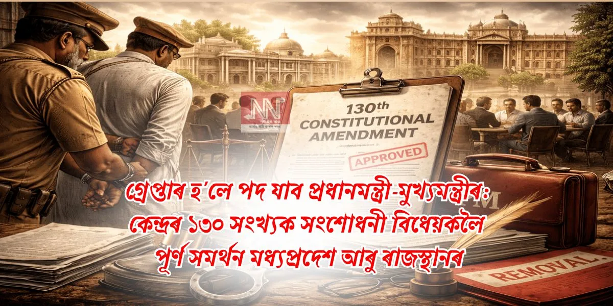 গুৰুতৰ অপৰাধমূলক গোচৰত গ্ৰেপ্তাৰ হৈ ন্যায়িক জিম্মালৈ প্ৰেৰণ কৰা প্ৰধানমন্ত্ৰী, মুখ্যমন্ত্ৰী বা আন যিকোনো মন্ত্ৰীক পদৰ পৰা বৰ্খাস্ত কৰাৰ এক নতুন সাংবিধানিক ব্যৱস্থা প্ৰৱৰ্তনৰ দিশে অগ্ৰসৰ হৈছে কেন্দ্ৰীয় চৰকাৰ। বুধবাৰে বিজেপিৰ সাংসদ অপৰাজিতা ষড়ংগীৰ অধ্যক্ষতাত অনুষ্ঠিত এখন সংসদীয় সমিতিৰ বৈঠকত মধ্যপ্ৰদেশ চৰকাৰে ‘সংবিধানৰ ১৩০ সংখ্যক সংশোধনী বিধেয়ক, ২০২৫’ৰ এই প্ৰস্তাৱৰ প্ৰতি পূৰ্ণ সমৰ্থন ব্যক্ত কৰিছে। […] The post গ্ৰেপ্তাৰ হ’লে পদ যাব প্ৰধানমন্ত্ৰী-মুখ্যমন্ত্ৰীৰ: কেন্দ্ৰৰ ১৩০ সংখ্যক সংশোধনী বিধেয়কলৈ পূৰ্ণ সমৰ্থন মধ্যপ্ৰদেশ আৰু ৰাজস্থানৰ appeared first on NORTHEAST NOW (Assamese) .