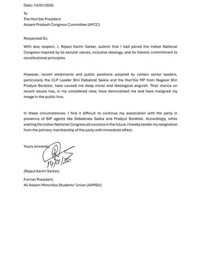যোৱা দেওবাৰে প্ৰদেশ কংগ্ৰেছৰ সভাপতি গৌৰৱ গগৈৰ উপস্থিতিত কংগ্ৰেছ দলত যোগদান কৰা আমছুৰ প্ৰাক্তন সভাপতি ৰেজাউল কৰিম সৰকাৰে অৱশেষত দলটোৰ পৰা পদত্যাগ কৰিছে। যোগদানৰ মাত্ৰ দুদিন পাছতেই তেওঁ এই সিদ্ধান্ত গ্ৰহণ কৰিবলগীয়া হয়। তেওঁৰ যোগদানক লৈ কংগ্ৰেছ দলৰ ভিতৰচ’ৰাত সৃষ্টি হোৱা তীব্ৰ বিৰোধ আৰু জ্যেষ্ঠ নেতাসকলৰ সমালোচনাৰ বাবেই তেওঁ এই চৰম পদক্ষেপ গ্ৰহণ কৰা বুলি […] The post বিবাদৰ পৰিণতি: কংগ্ৰেছ ত্যাগ কৰিলে প্ৰাক্তন আমছু নেতা ৰেজাউল কৰিম সৰকাৰে appeared first on NORTHEAST NOW (Assamese) .