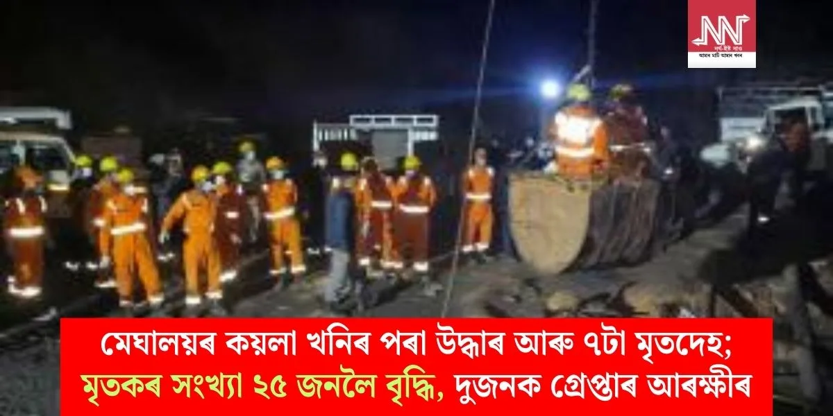 মেঘালয়ৰ কয়লা খনিৰ পৰা উদ্ধাৰ আৰু ৭টা মৃতদেহ; মৃতকৰ সংখ্যা ২৫ জনলৈ বৃদ্ধি, দুজনক গ্ৰেপ্তাৰ আৰক্ষীৰ