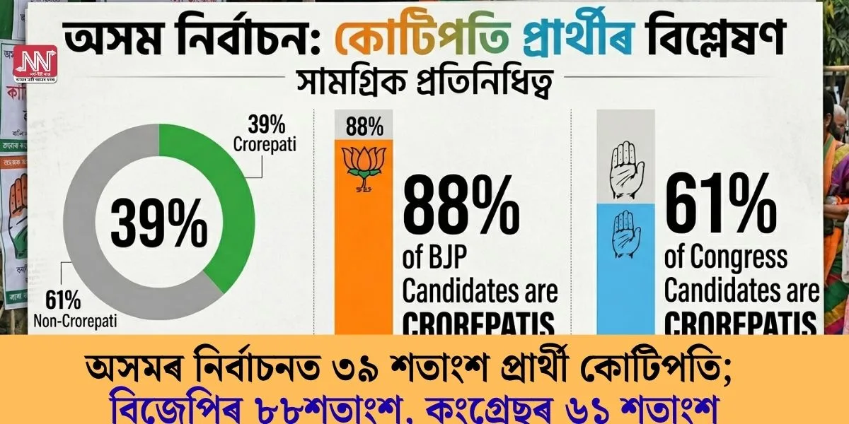 অসমৰ নিৰ্বাচনত প্ৰতিদ্বন্দ্বিতা কৰা প্ৰাৰ্থীসকলৰ ধন-সম্পত্তিৰ তালিকাই এইবাৰ সকলোৰে দৃষ্টি আকৰ্ষণ কৰিছে। ২০২৬ চনৰ বিধানসভা নিৰ্বাচনত প্ৰতিদ্বন্দ্বিতা কৰা প্ৰতি ১০ জন প্ৰাৰ্থীৰ ভিতৰত প্ৰায় ৪ জনেই এক কোটি টকাৰ ওপৰত সম্পত্তি ঘোষণা কৰিছে। এছ’চিয়েশ্যন ফৰ ডেম’ক্ৰেটিক ৰিফৰ্মছ (এডিআৰ)ৰ এক বিশ্লেষণত প্ৰকাশ পাইছে এই তথ্য। মঙলবাৰে সদৰী কৰা প্ৰতিবেদনত প্ৰকাশ পাইছে যে সকলো ৭২২ প্ৰাৰ্থীৰ স্বঘোষিত […] The post অসমৰ নিৰ্বাচনত ৩৯ শতাংশ প্ৰাৰ্থী কোটিপতি; বিজেপিৰ ৮৮শতাংশ, কংগ্ৰেছৰ ৬১ শতাংশ appeared first on NORTHEAST NOW (Assamese) .