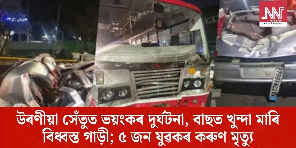 উৰণীয়া সেঁতুত ভয়ংকৰ দুৰ্ঘটনা, বাছত খুন্দা মাৰি বিধ্বস্ত গাড়ী; ৫ জন যুৱকৰ কৰুণ মৃত্যু