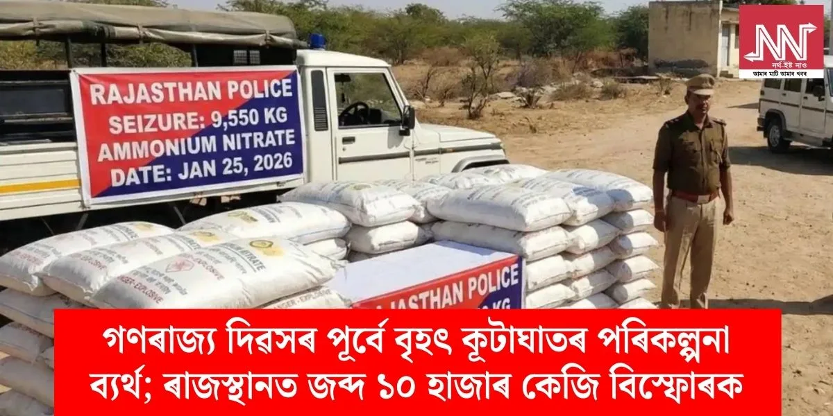 গণৰাজ্য দিৱসৰ পূৰ্বৰ নিশা ৰাজস্থান আৰক্ষীয়ে বৃহৎ কূতাঘাতৰ চক্ৰান্ত বিফল কৰে। নগৌ জিলাৰ কৃষিভূমিৰ পৰা বৃহৎ পৰিমাণৰ বিস্ফোৰক উদ্ধাৰ কৰা হৈছে। এই ঘটনাত এজন লোকক গ্ৰেপ্তাৰ কৰা হৈছে। এক গোপন সূত্ৰৰ ভিত্তিত শনিবাৰে গভীৰ নিশা নগৌৰ জিলাৰ হৰছৌৰ গাঁৱত অভিযান চলোৱা হয়। সেই সময়ত এখন পথাৰত ১৮৭টা বেগত ভৰোৱা মুঠ ৯৫৫০ কিলোগ্ৰাম এমোনিয়াম নাইট্ৰেট উদ্ধাৰ […] The post গণৰাজ্য দিৱসৰ পূৰ্বে বৃহৎ কূটাঘাতৰ পৰিকল্পনা ব্যৰ্থ; ৰাজস্থানত জব্দ ১০ হাজাৰ কেজি বিস্ফোৰক appeared first on NORTHEAST NOW (Assamese) .