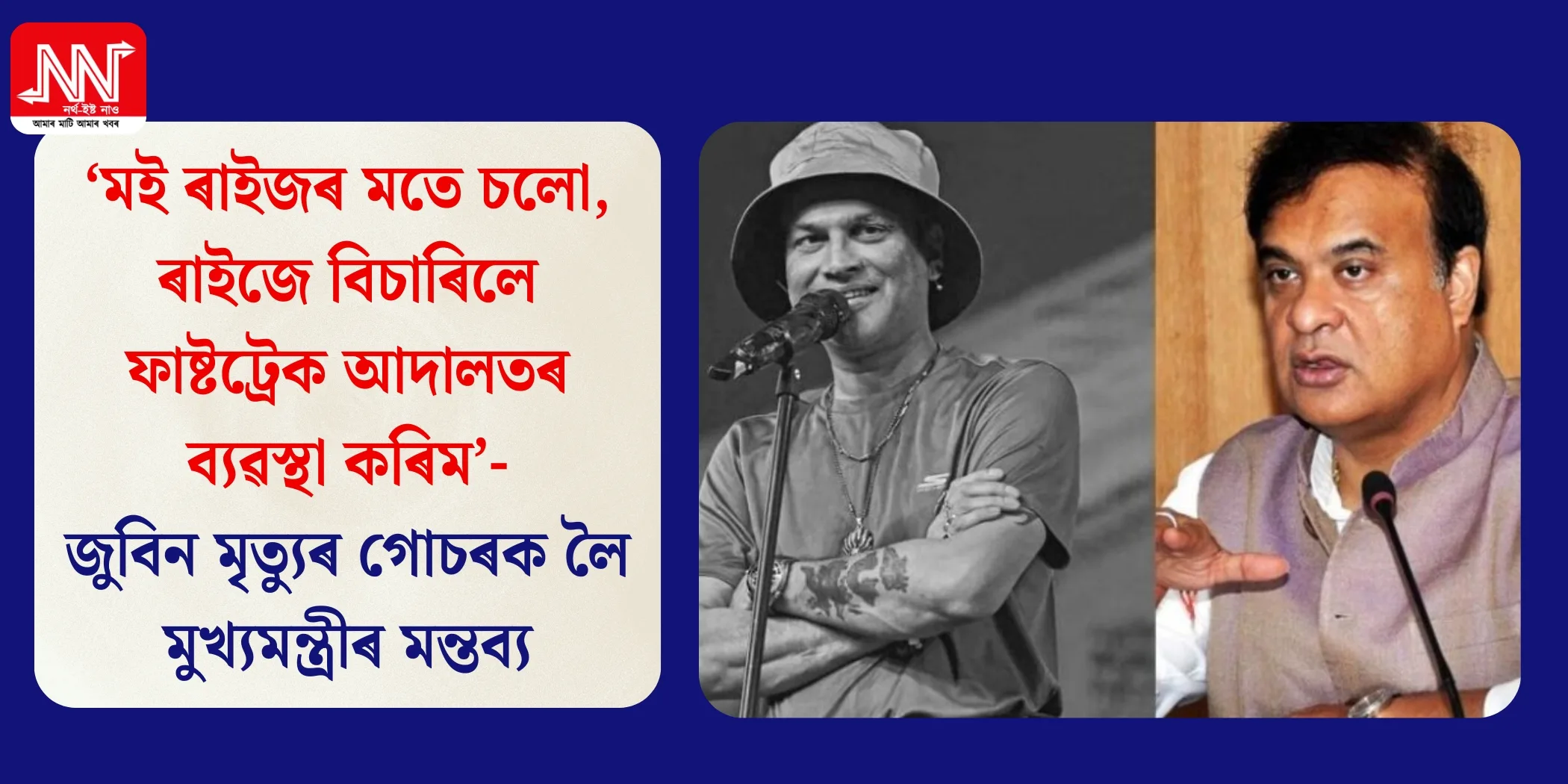 জুবিন গাৰ্গৰ মৃত্যুৰ গোচৰক কেন্দ্ৰ কৰি বৰ্তমান ৰাজ্যৰ ৰাজনীতি উত্তপ্ত হৈ পৰিছে। এই সন্দৰ্ভত মুখ্যমন্ত্ৰী হিমন্ত বিশ্ব শৰ্মাই এক গুৰুত্বপূৰ্ণ মন্তব্য প্ৰদান কৰিছে। মুখ্যমন্ত্ৰীয়ে জানিবলৈ দিয়ে যে তেওঁ সদায় ৰাইজৰ মতামতক সন্মান কৰে আৰু যদি ৰাইজে বিচাৰে তেন্তে এই গোচৰটোৰ বাবে ফাষ্টট্ৰেক আদালত গঠন কৰিবলৈ তেওঁ সাজু। কিন্তু ইয়াৰ আঁৰত এক গভীৰ চক্ৰান্ত চলি থকা […] The post ‘মই ৰাইজৰ মতে চলো, ৰাইজে বিচাৰিলে ফাষ্টট্ৰেক আদালতৰ ব্যৱস্থা কৰিম’- জুবিন মৃত্যুৰ গোচৰক লৈ মুখ্যমন্ত্ৰীৰ মন্তব্য appeared first on NORTHEAST NOW (Assamese) .